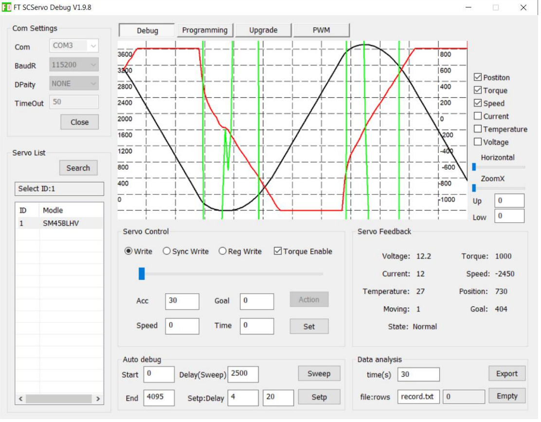 Then click “open” to make sure you’re sending data over that port, then click “search.” You should get an ID of 1 and the “Modle” of STS3215. If you see lines moving on the graph, you’re good. If not, click the model name or ID and it should fire up. The green line is speed and the black line is position.