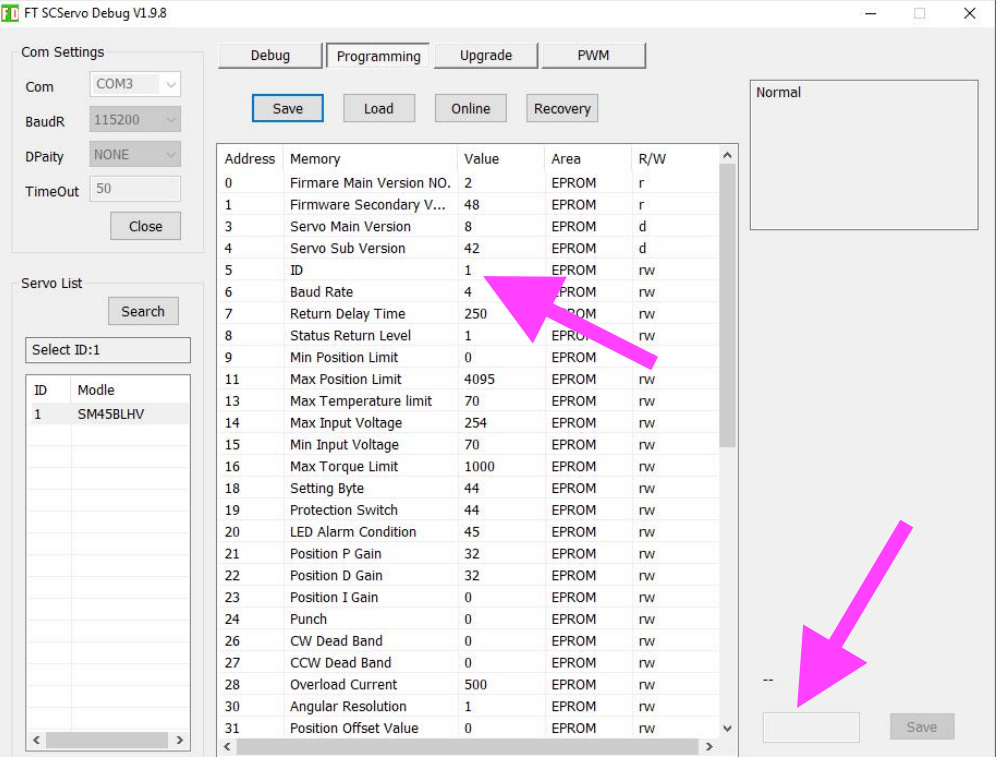 The first entry that you can "rw" is address 5 for the ID. Click that. It’ll highlight in blue. Down in the lower right corner, next to the “save” button, is a window where you can reset the ID number of the servo. Type in the number and hit save, and it should give you a nice pleasant chime of success and a pop-up window with the same. If not, then you probably went too fast from the previous servo and didn’t search or select the new servo or select the new ID under programming.